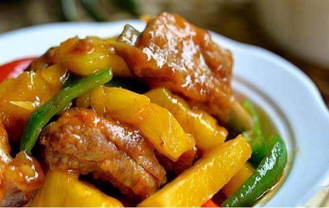 5、加适量盐,加水盖盖,中小火收汁,剩少量汤汁时,加入 菠萝片,翻炒出锅。