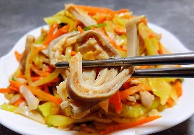 3、起锅热油,倒入金针菇、木耳丝、胡萝卜丝、尖椒丝炒出香味;