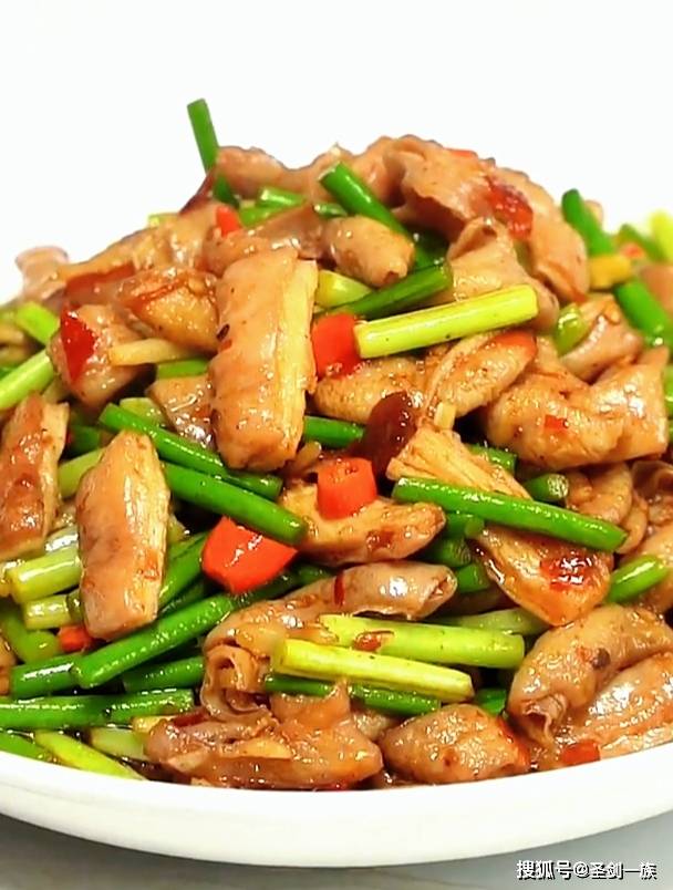 7.出锅前放洋葱丝,翻炒均匀即可。肥肠炒蒜苔