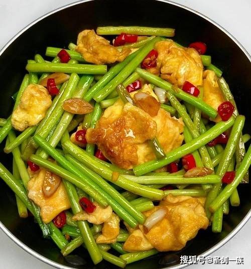6. 加入鸡蛋:将炒好的鸡蛋块放回锅中,轻轻翻炒,确保鸡蛋和蒜苔混合均匀。