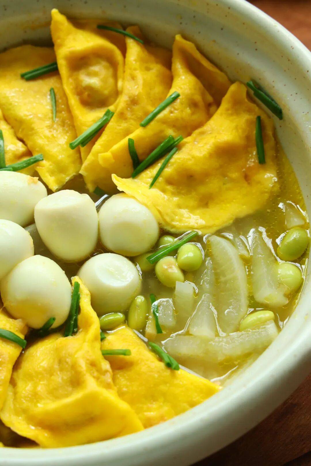 要说秋天里最治愈的一锅,那肯定少不了这一锅热气腾腾的蛋饺砂锅!金黄小巧的蛋饺,配上清甜的白萝卜和翠绿的毛豆,再来几颗圆滚滚的鹌鹑蛋,光看颜值就忍不住心动啦!