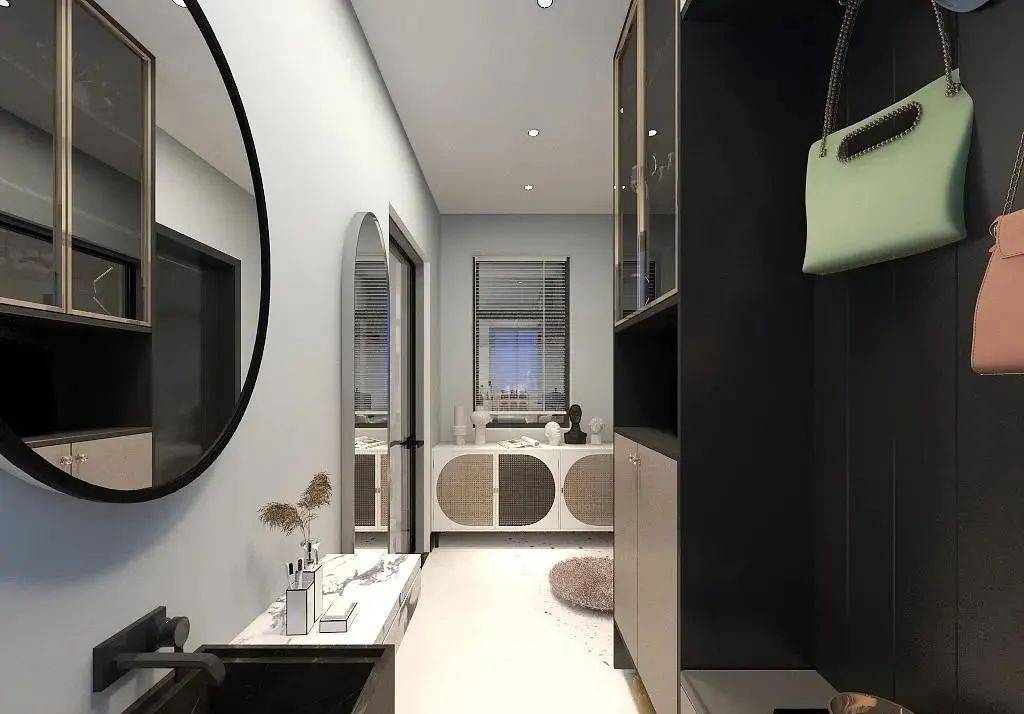 材质选择:大理石、岩板(墙面/台面)、金属(黄铜/铝合金)、长虹玻璃(柜门)提升质感。