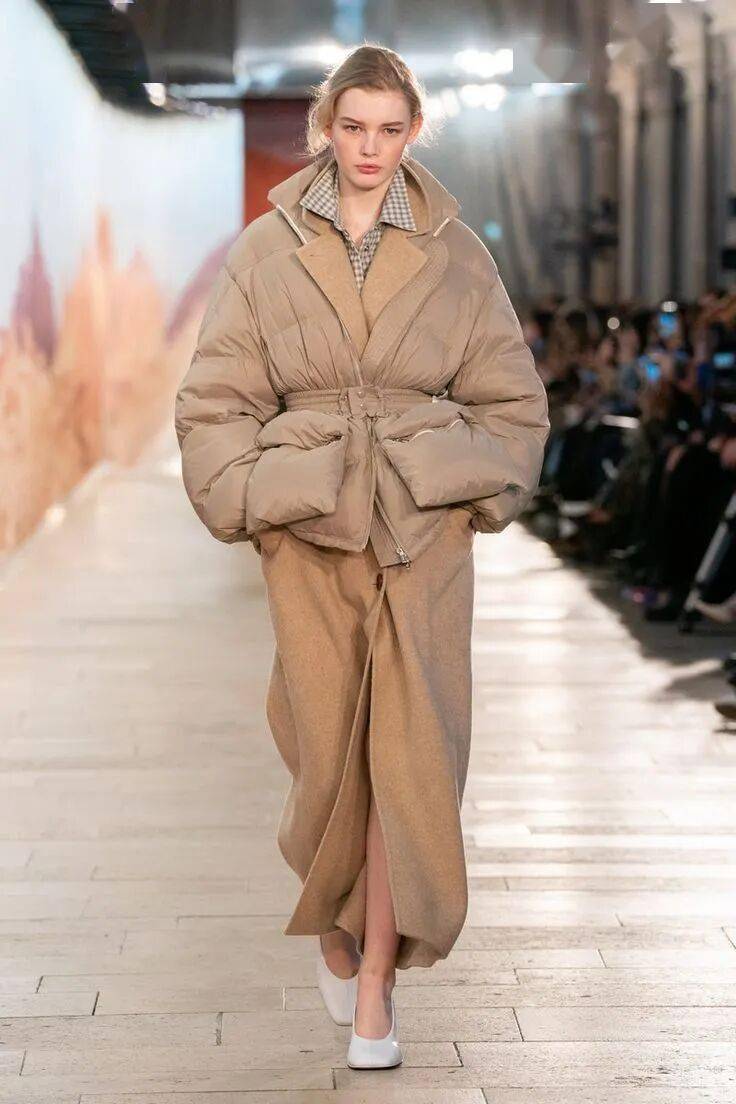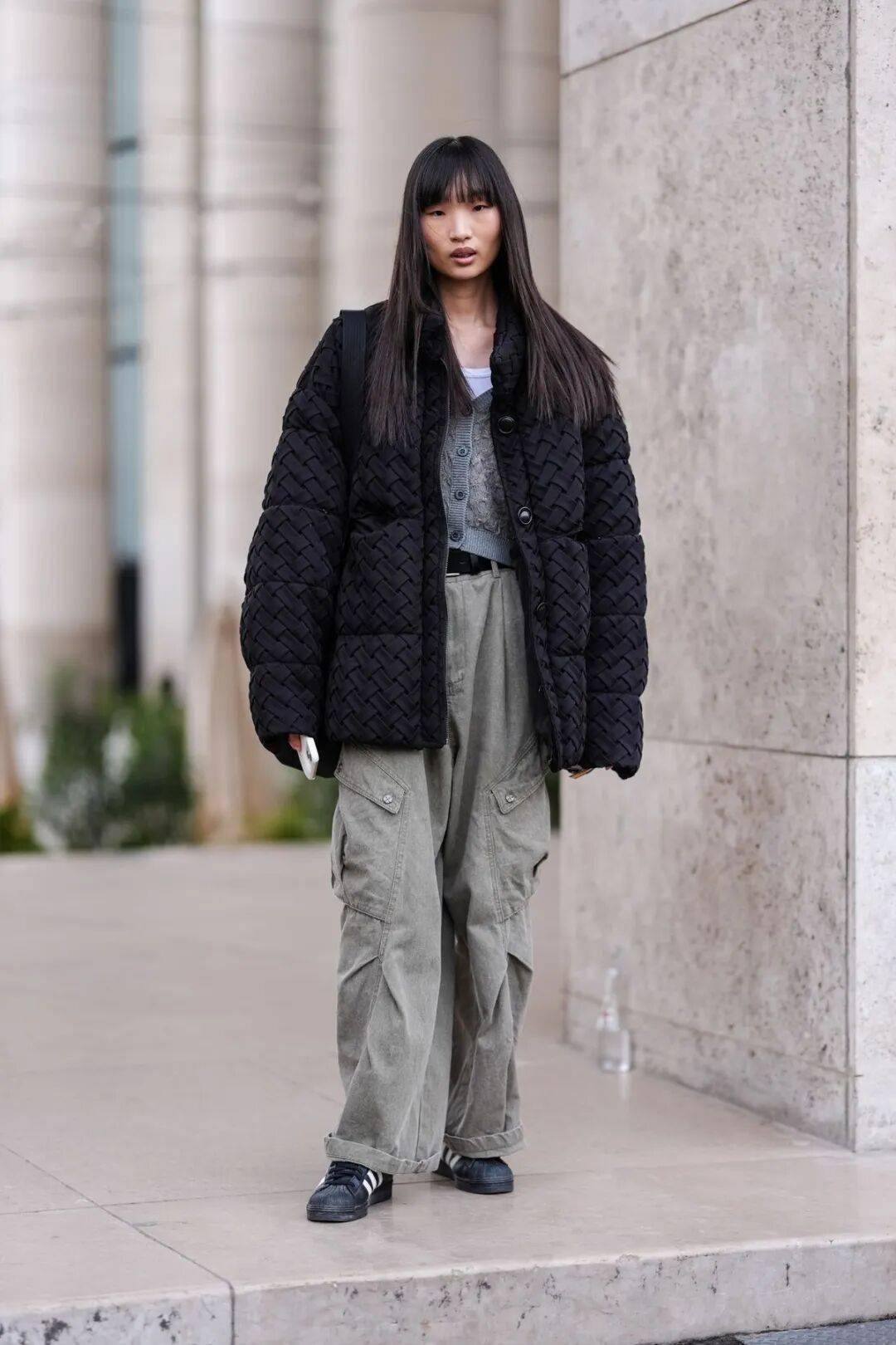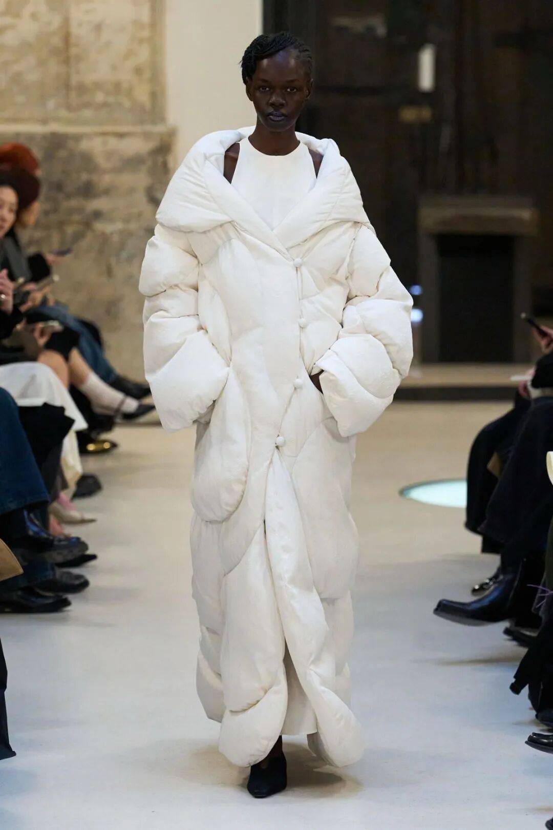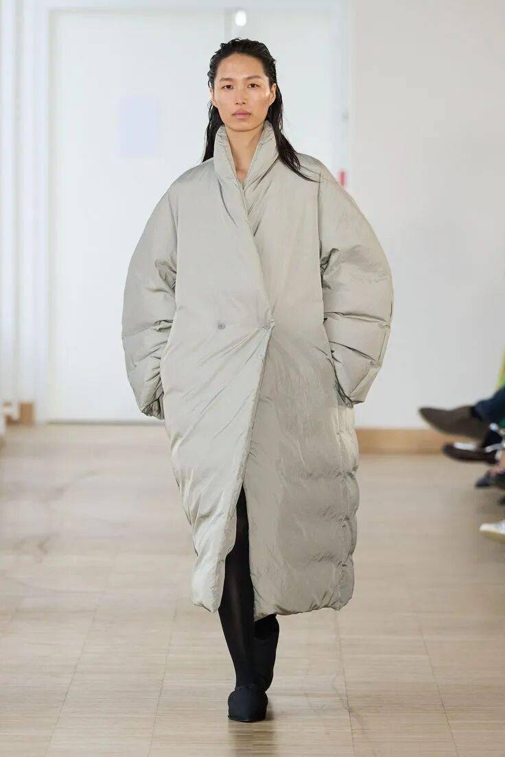 廓形特征:宽大下摆+顺势领口,填充轻盈却保有包裹感,适合打造大气场造型。