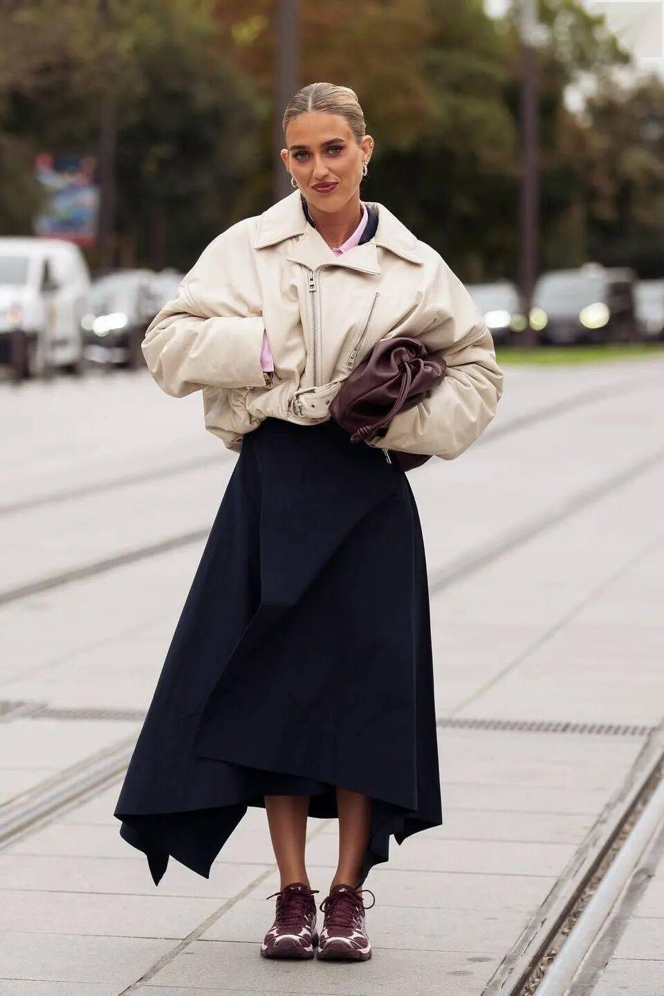 革新点:打破传统臃肿印象,通过缩短衣长释放下半身空间,提升穿搭灵活度。