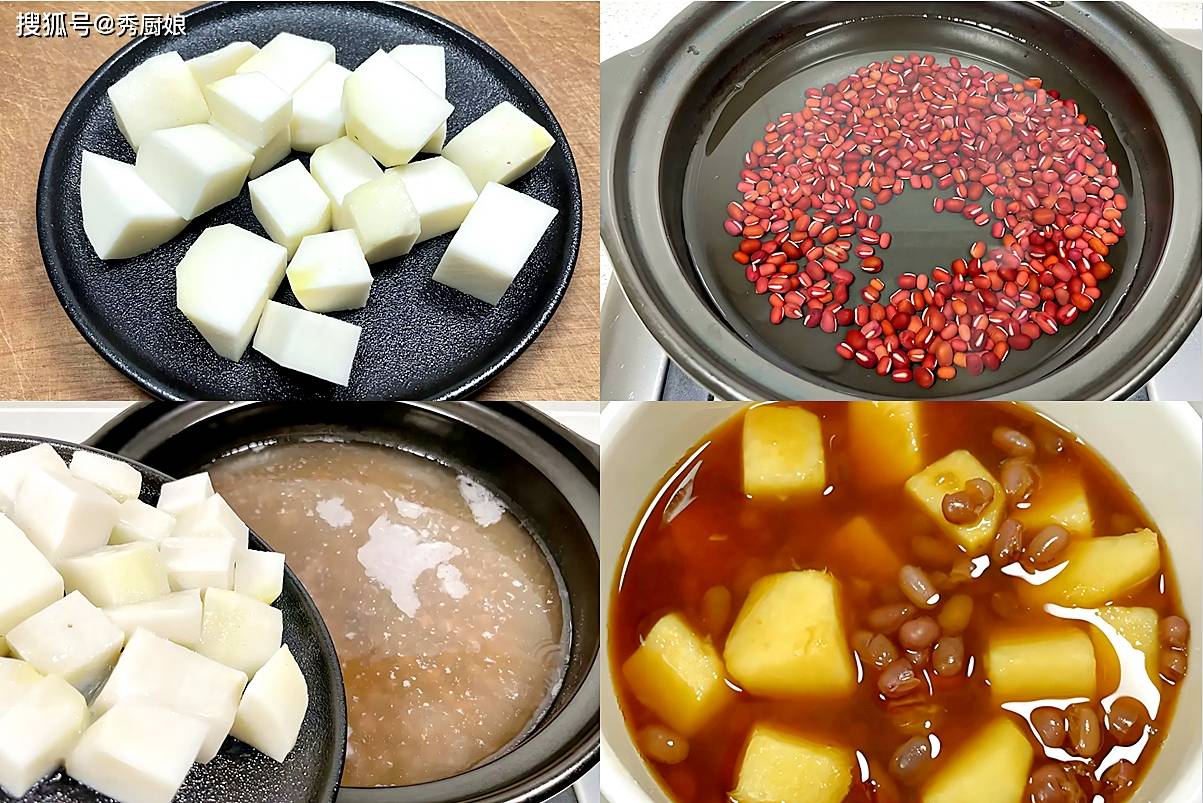 1. 预处理:红小豆提前浸泡2小时(若赶时间可用高压锅压15分钟)。芋头去皮切小块。