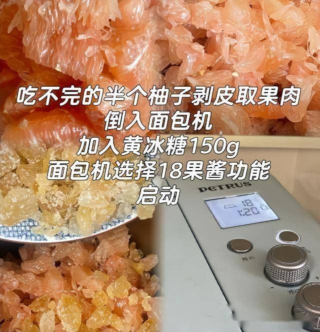 把柚子果肉全都倒入面包机里面,加入黄冰糖150g,面包机选择果酱模式,启动即可。