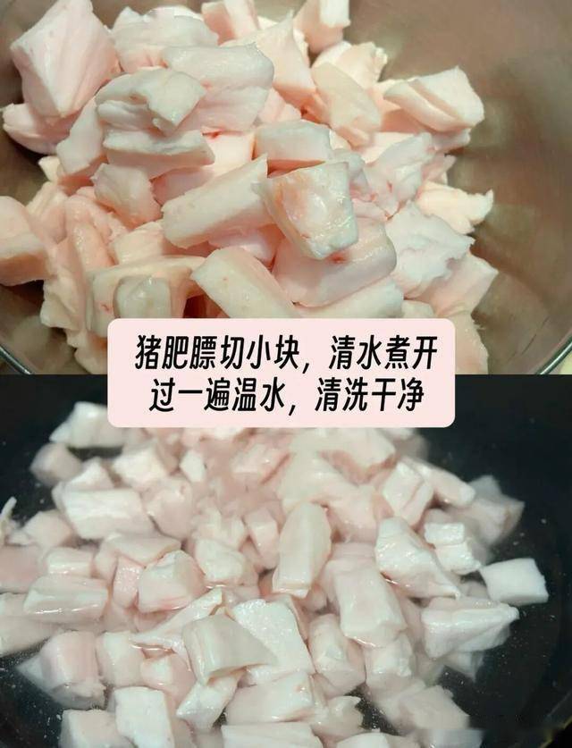 猪肥膘先切成小块,再用清水煮开,过一边温水后,清干净。