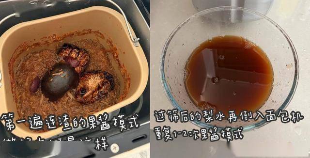 第一遍果酱模式厚,把果酱过筛一下,过筛厚的梨水再倒入面包机里面,重复1~2次果酱模式即可。