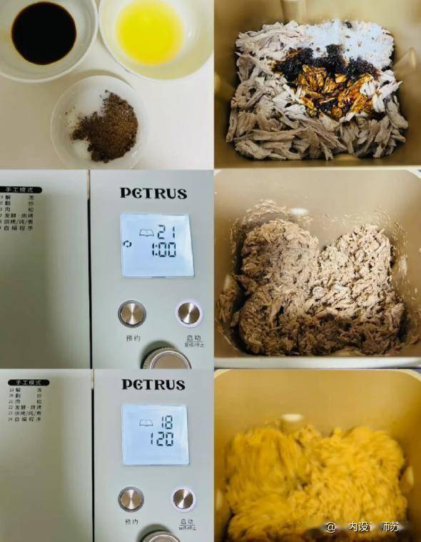 | 肉松成团不蓬松    | 最后10分钟开盖搅拌               | 加速水分蒸发                |