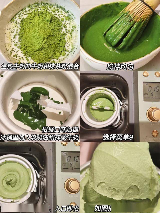 制作方式很简单:温热牛奶+抹茶粉搅拌均匀,和淡奶油一起放入面包机的冰桶里面,选择冰淇淋模式,搅拌两次后,吃起来口感会更加细腻。