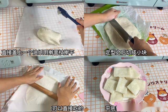 把面团取出来之后,用擀面杖擀一下,定型之后切成小块。