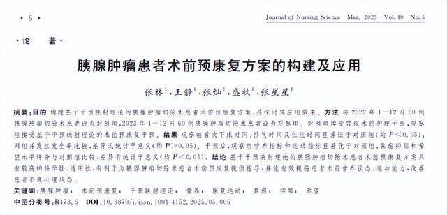 胰腺肿瘤患者术前预康复方案的构建及应用,张林,王静,张灿,盛秋,张星星,护理学杂志,2025-03-05