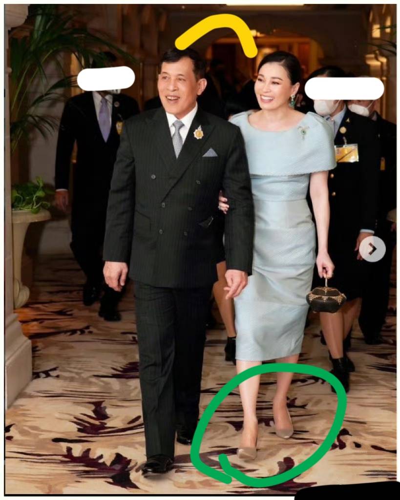 有人捕捉到细节之处后感叹,苏提达是如何做到穿不穿上她那双10厘米的高跟鞋,站在国王老公身边都是“一样高”的呢?