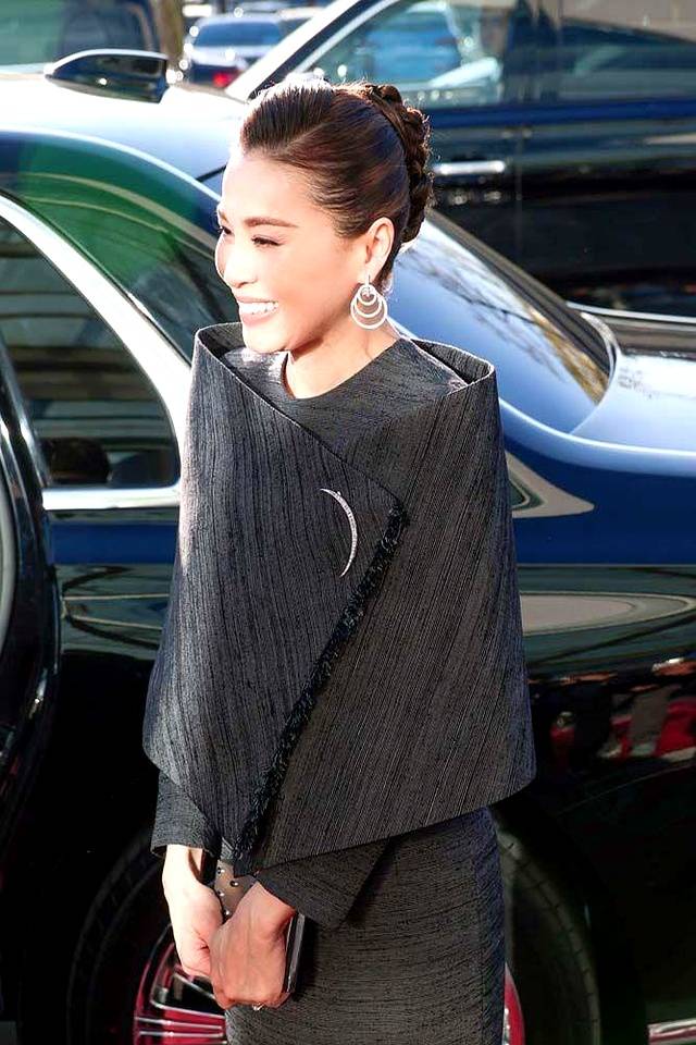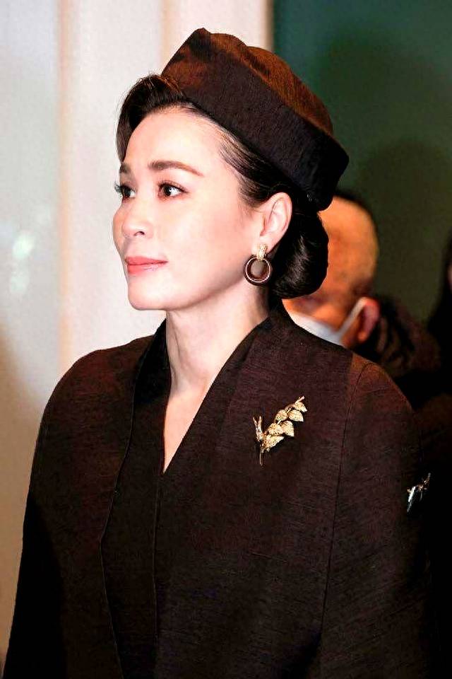 苏提达王后身着高级灰斗篷大衣,配简约珠宝,低调优雅(因处泰太后丧期)。