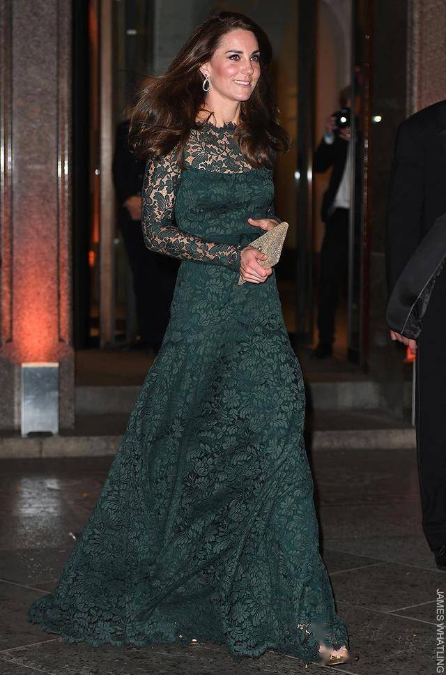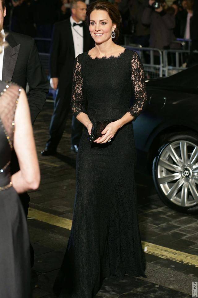 当时还是剑桥公爵夫人的她,选择了黛安・冯・芙丝汀宝(Diane von Furstenberg)的经典黑色蕾丝礼服,上身修身,袖子为薄纱材质,裙摆拖地。