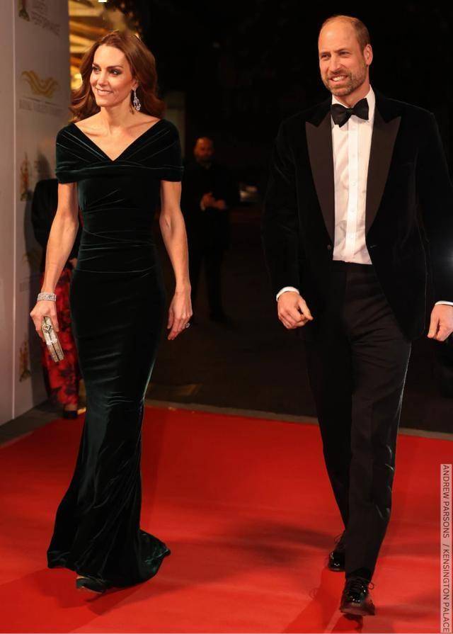 今年的汇演,王妃选择了德国品牌塔尔博特・伦霍夫(Talbot Runhof)的深祖母绿丝绒礼服。该品牌以流畅线条、立体垂坠感和低调大气的晚装设计著称。露肩肖像领与流畅无缝的直筒剪裁,赋予整体造型十足的王室风范。