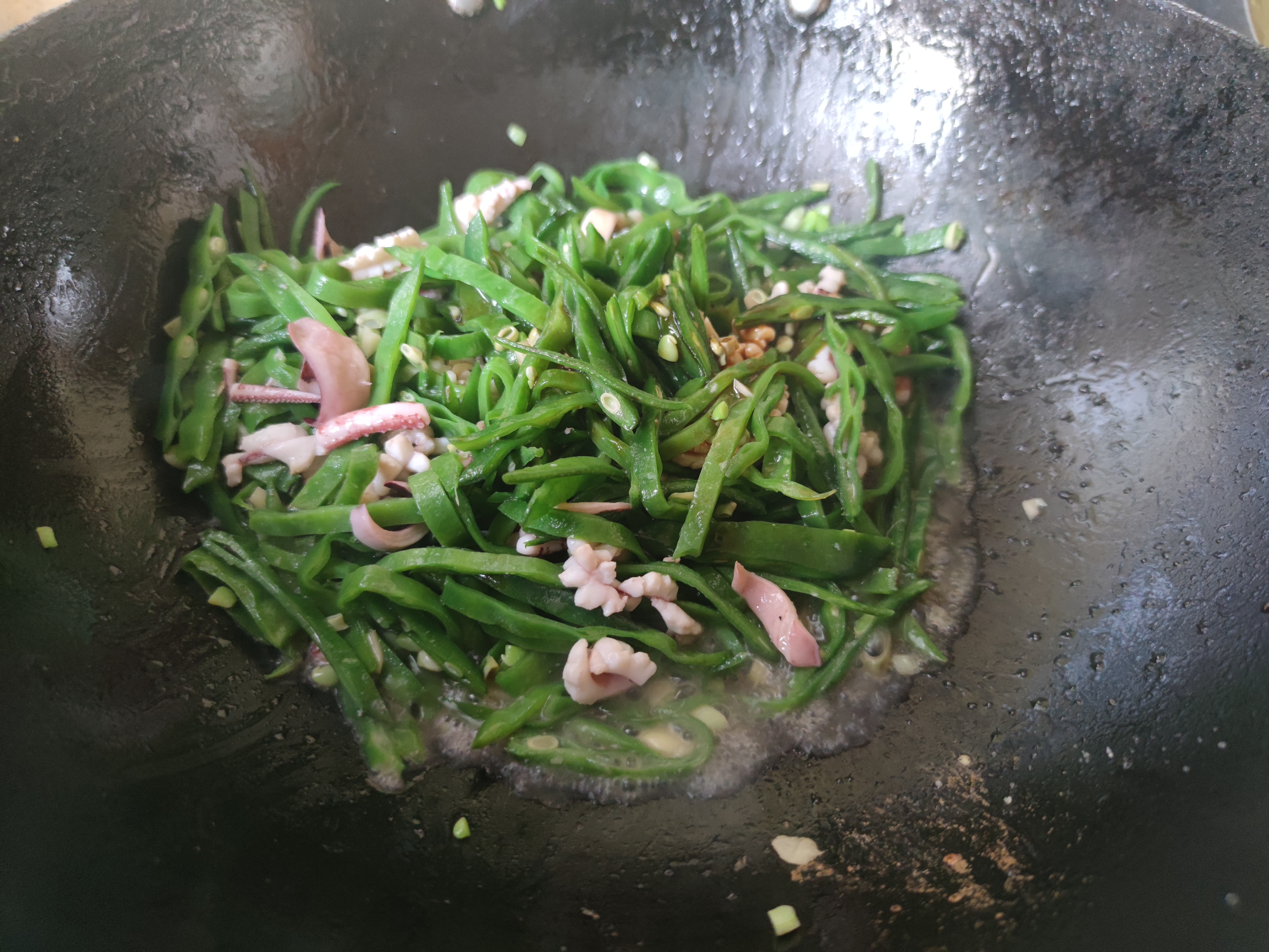 3.锅中入油下入花椒粒小火炸香,捞出花椒粒后入蒜末爆出香味,下入沥干水分的梅豆丝翻炒均匀,烹入料酒和蚝油炒香,然后下入乌贼丝炒匀,加入盐和胡椒粉调味,滴几滴花椒油即可出锅享用。
