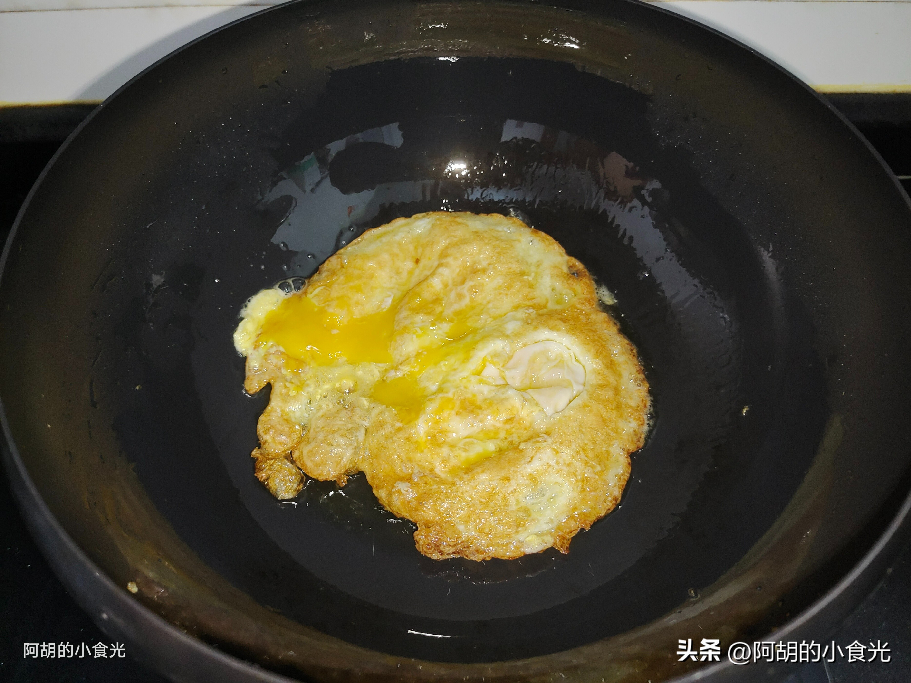第三步:所有主要的食材都准备好,下面就来开火烹饪。先小火把锅烘干,淋入一些菜籽油烧热,而后直接打入两个鸡蛋煎一煎,煎好一面再翻面煎一煎,煎成荷包蛋即可。而后用铲子把荷包蛋切开成大块。