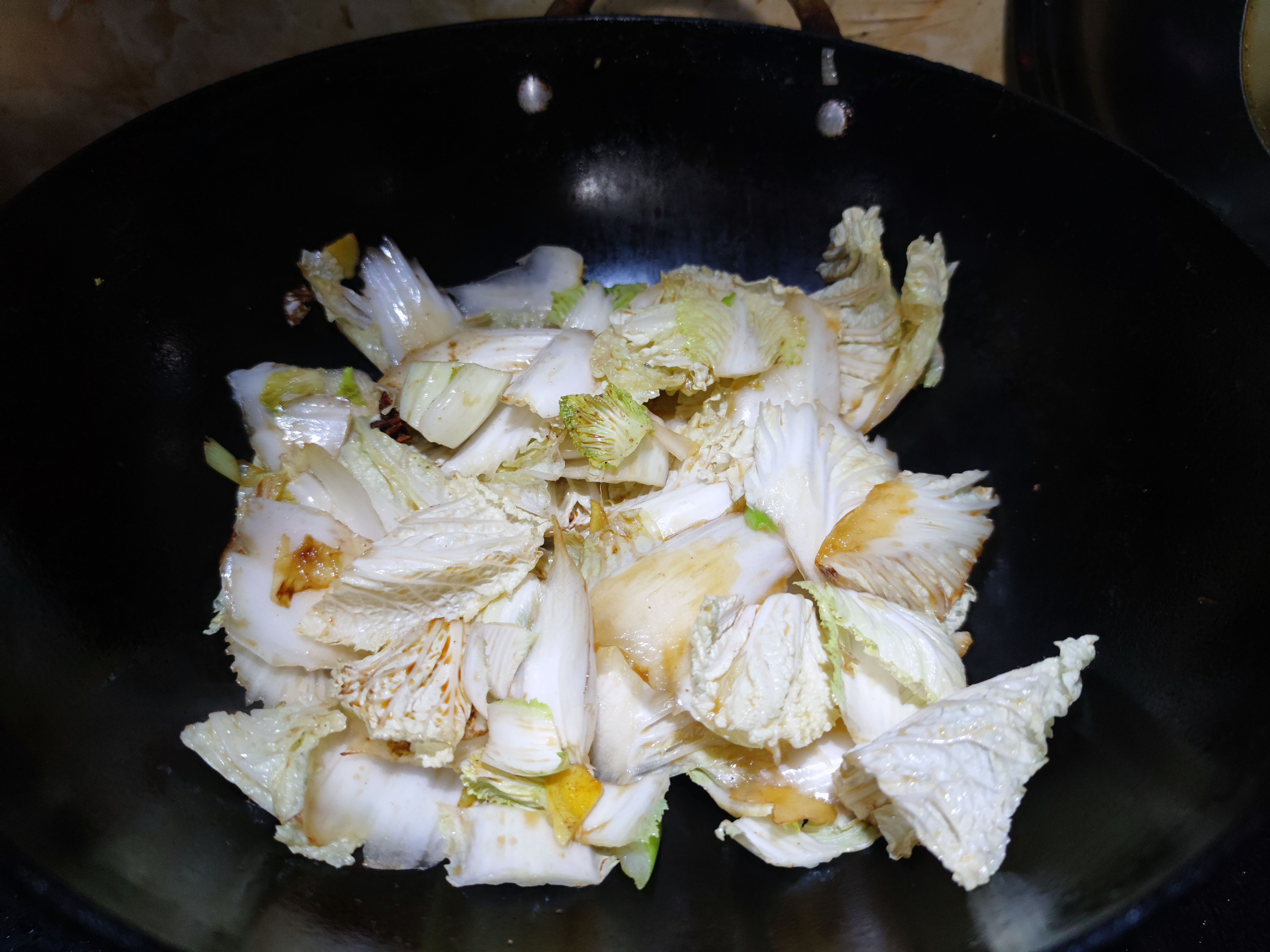 3.锅中留底油爆香葱姜蒜和一瓣八角,下入白菜煸炒出水汽,烹入料酒和一品鲜酱油炒匀。