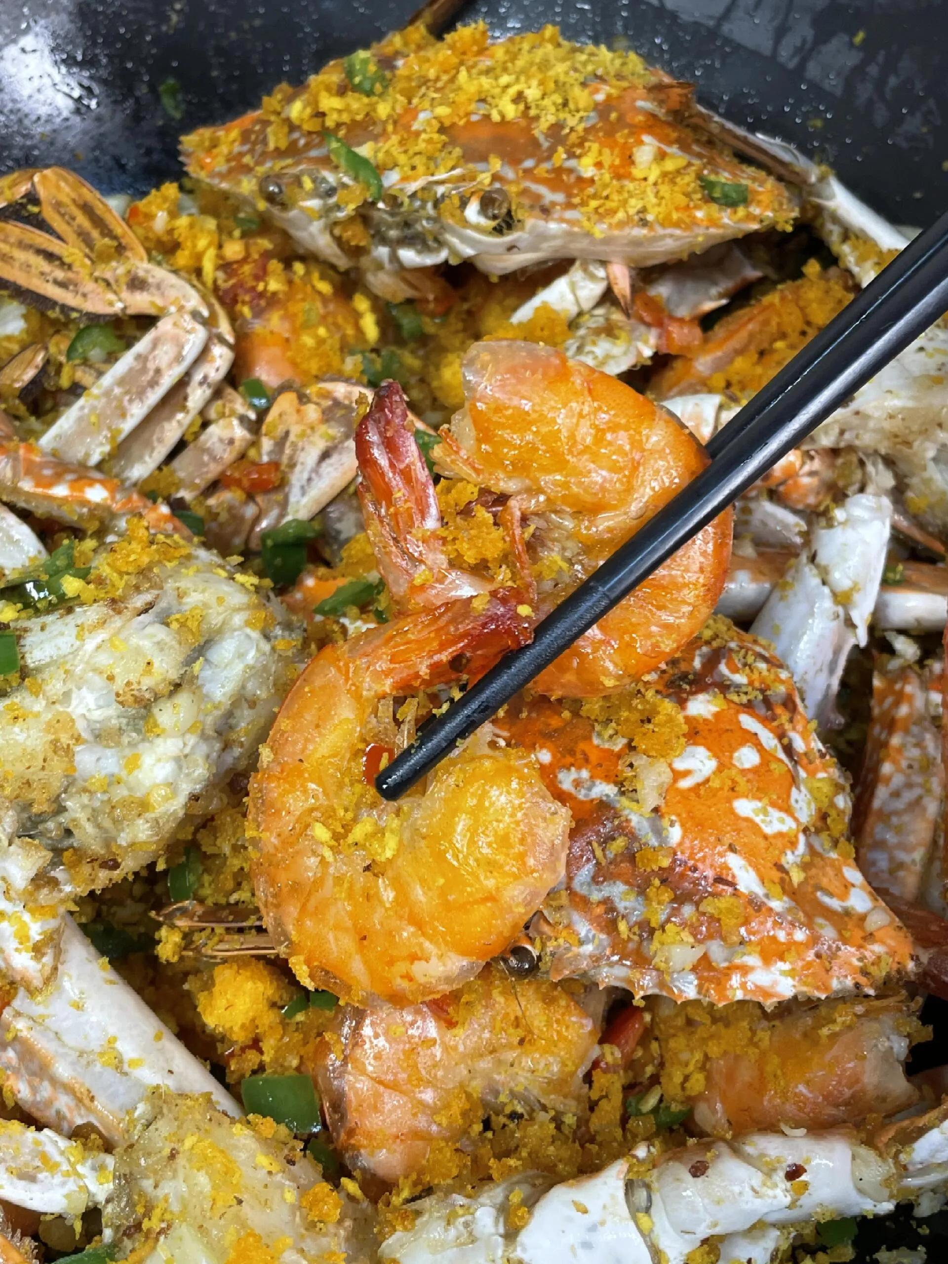 花蟹大虾肉质鲜嫩,蒜香酥脆又鲜甜,自己在家做一大盘,把家人朋友都香迷糊了~